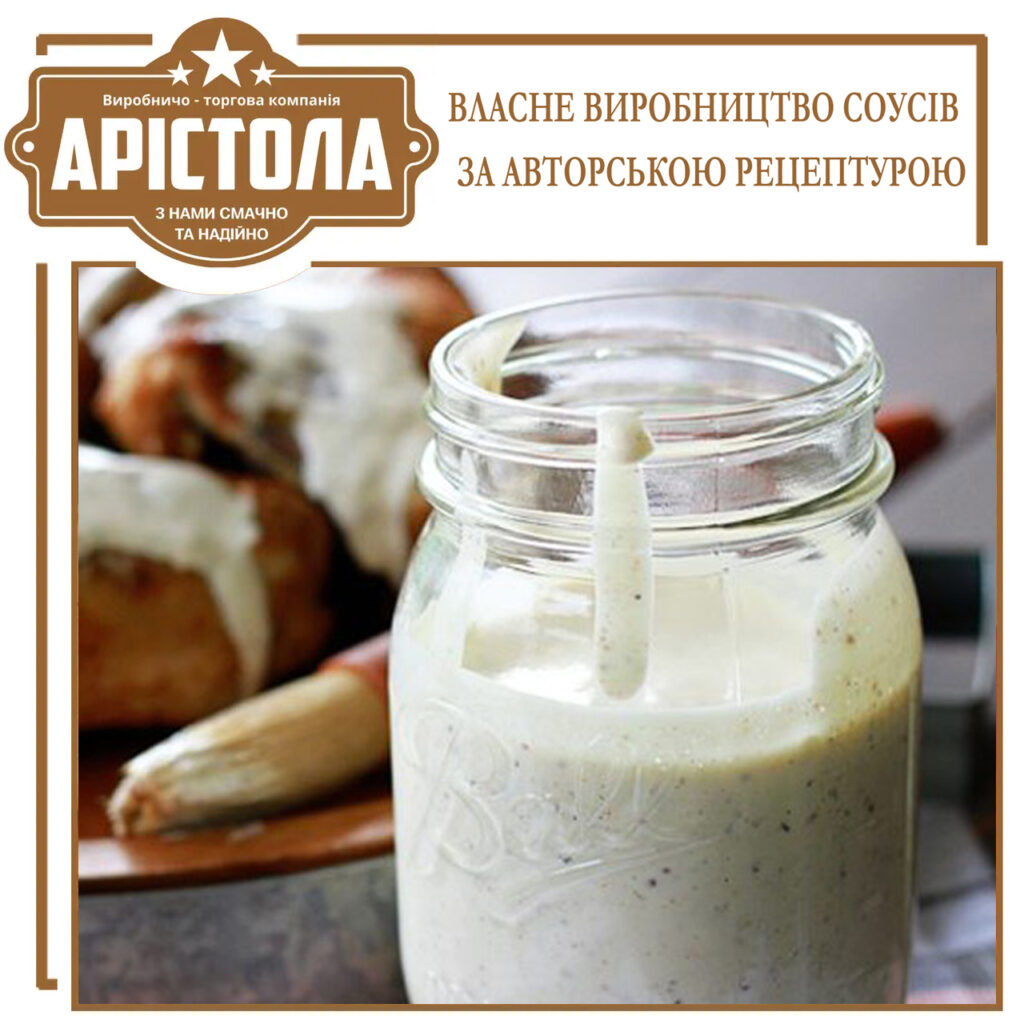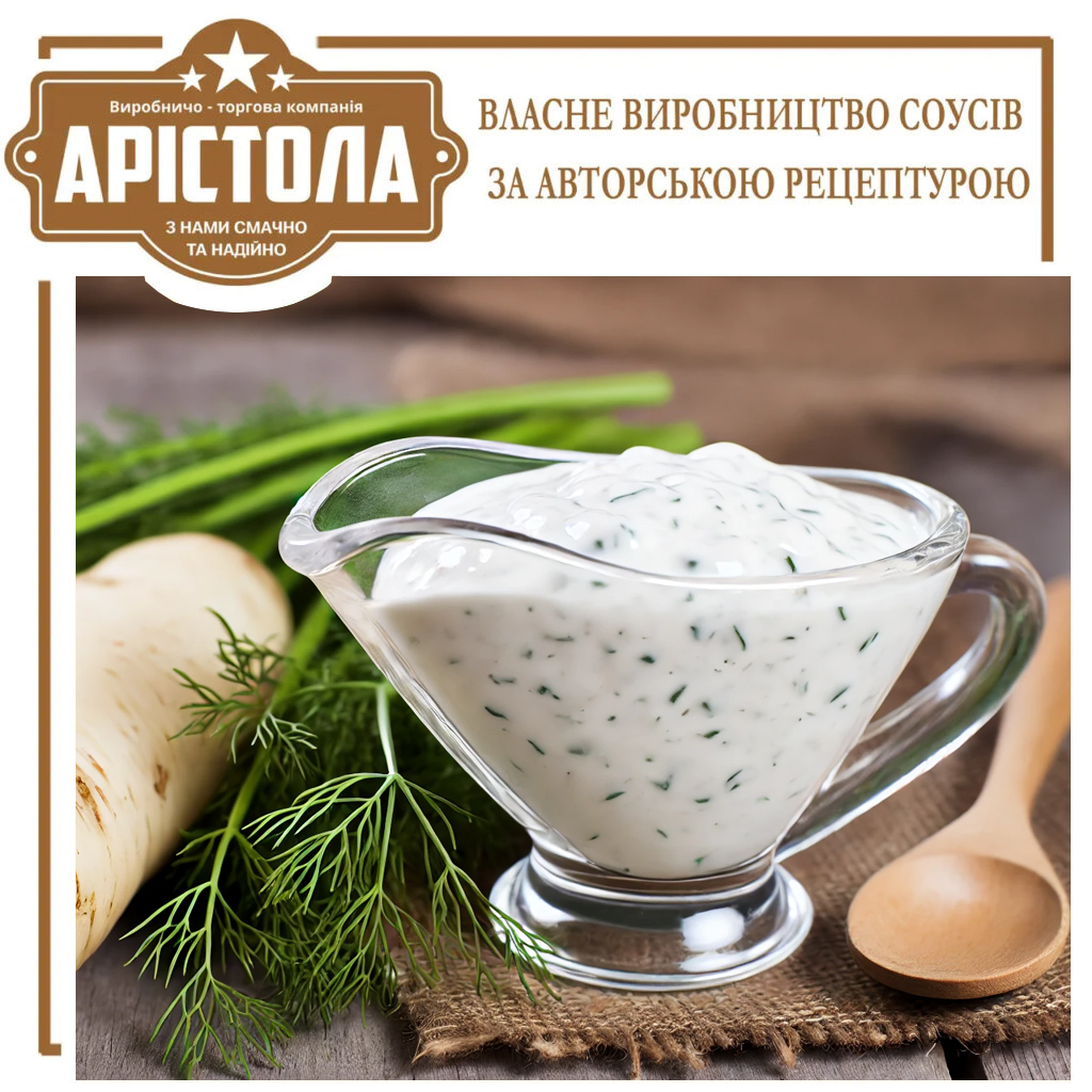 вода питна, олія соняшникова рафінована дезодорована (28%), цукор, крохмалі модифіковані, сіль кухонна, гірчиця харчова, хрін столовий, регулятори кислотності: оцет яблучний, кислота оцтова, кислота лимонна; часник сушений копчений, підсилювач смаку глутамат натрію, ароматізатори в змінних пропорціях, кріп сушений, стабілізатори: ксантанова камедь, гуарова камедь; консервант сорбат калію, барвник бета-каротин, олеорезин гірчиці.